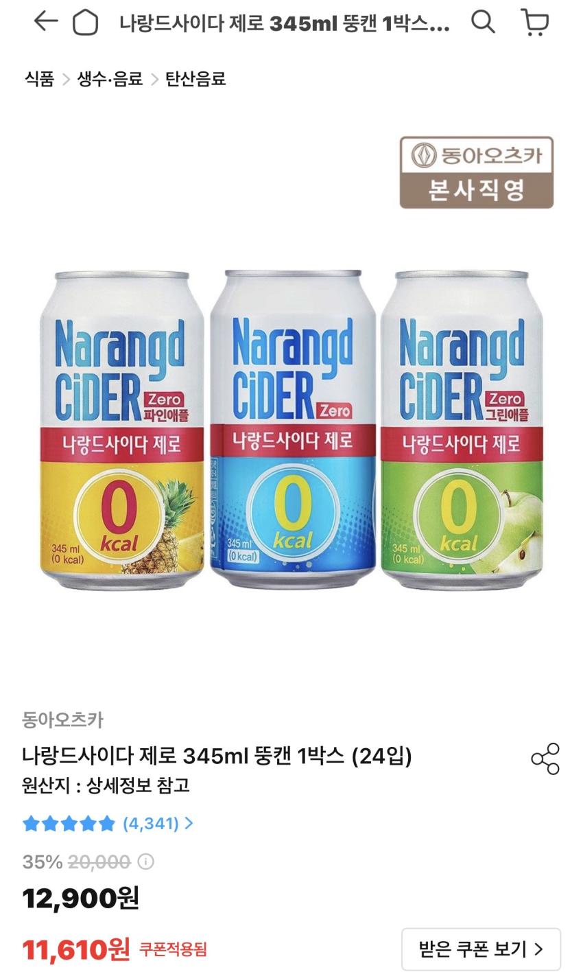 나랑드사이다 제로 345ml 뚱캔 24입 10,499원