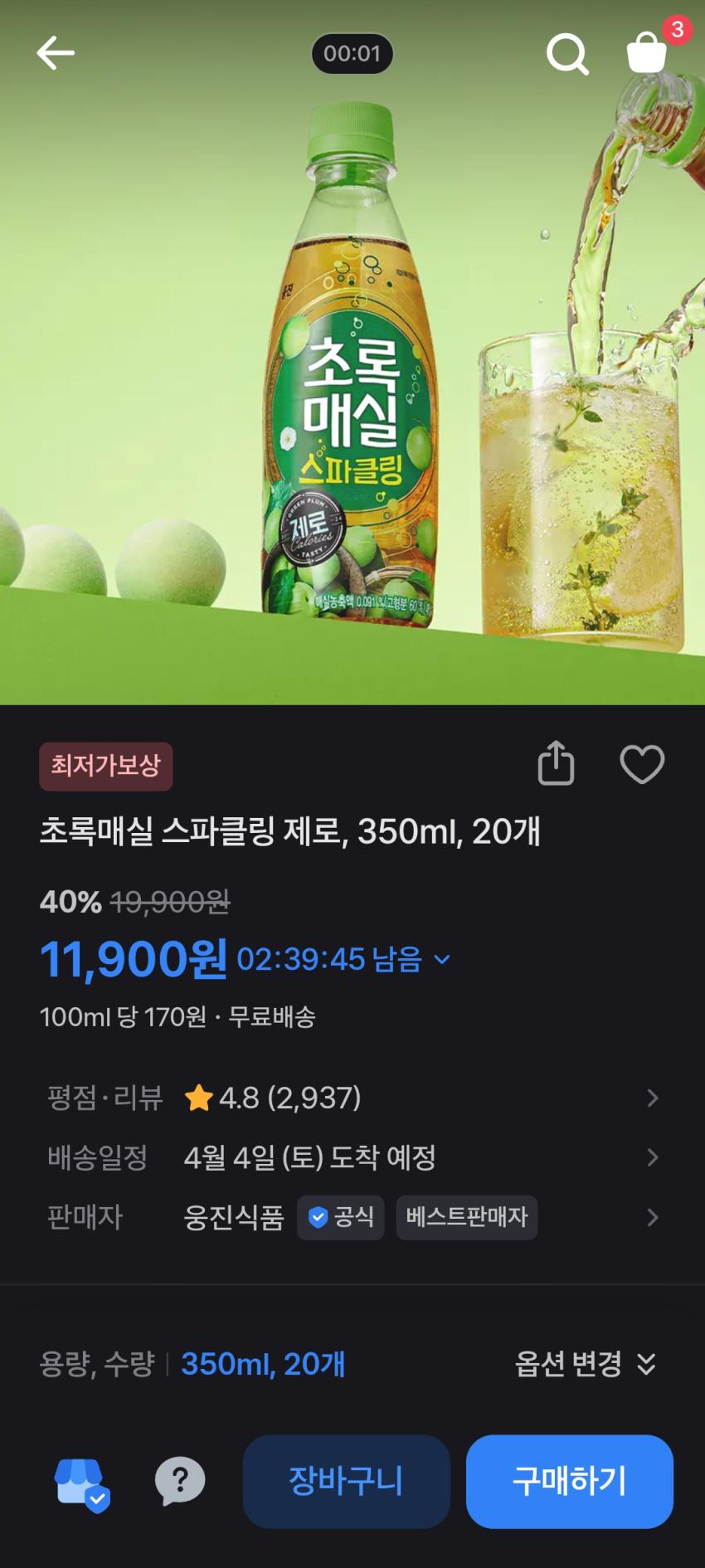 토스 초록매실스파클링 제로 11900 무배 - 딜모아