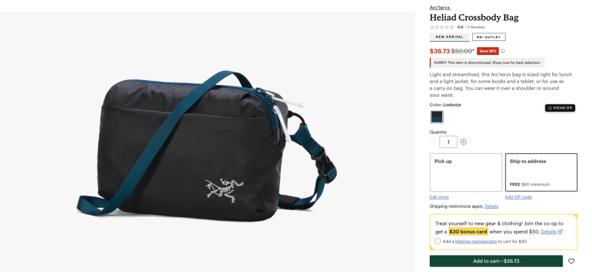 아크테릭스 헬리아드 크로스백 로드스타 $36.7