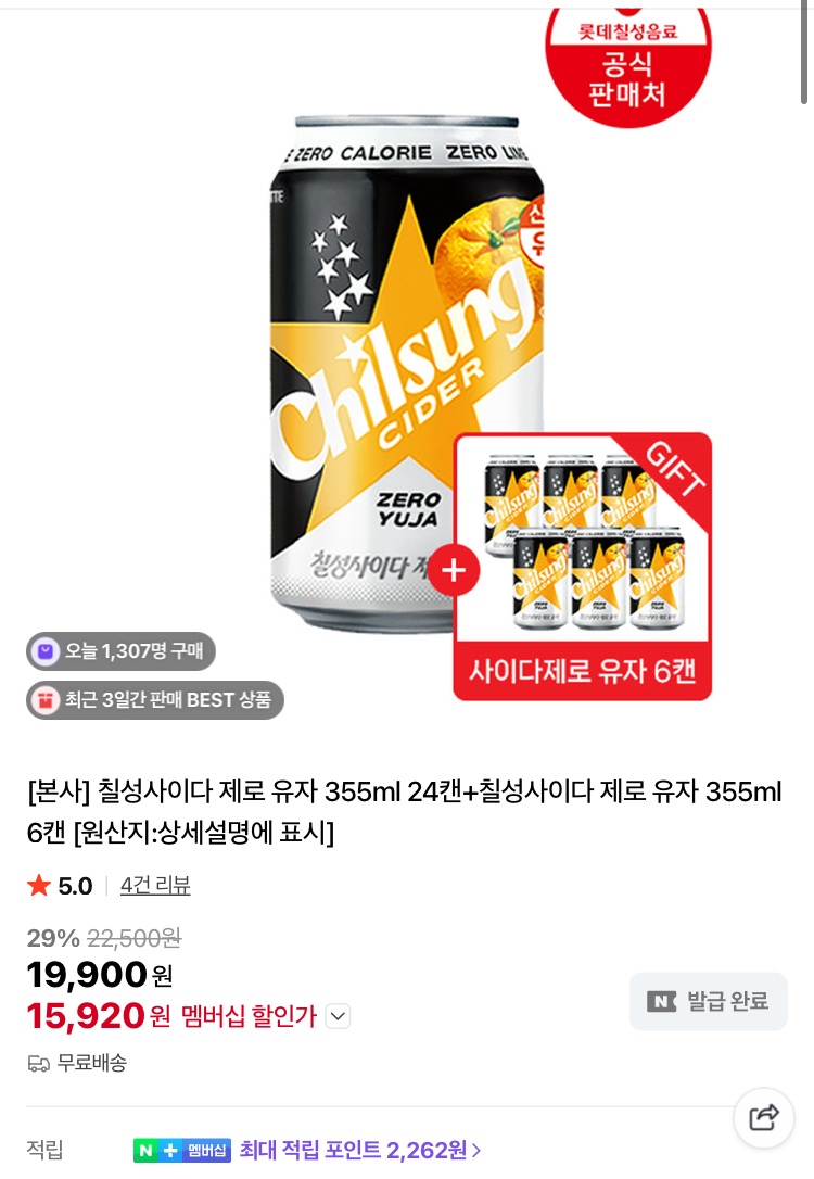 칠성 사이다제로 유자 355ml 30캔 15920원