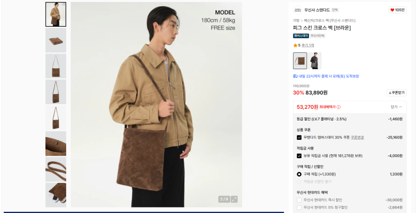 무탠다드 천연가죽 피그스킨 숄더백 5만원대