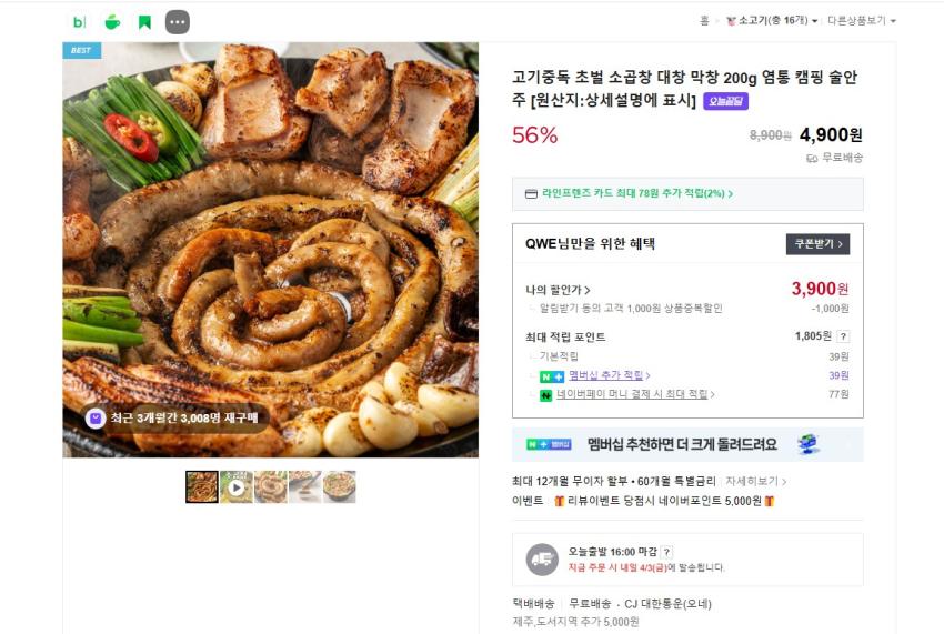 소곱창 160g + 소스 3900원 무배 - 딜모아
