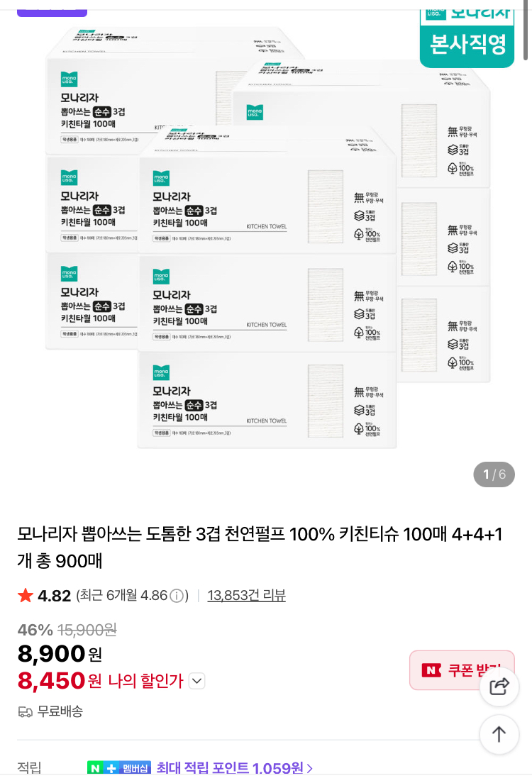모나리자 도톰한 3겹 천연펄프 100% 키친티슈 900...