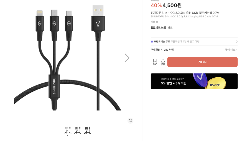 신지모루 3-in-1 QC 3.0 고속 충전 USB 케이블 ~3... - 딜모아