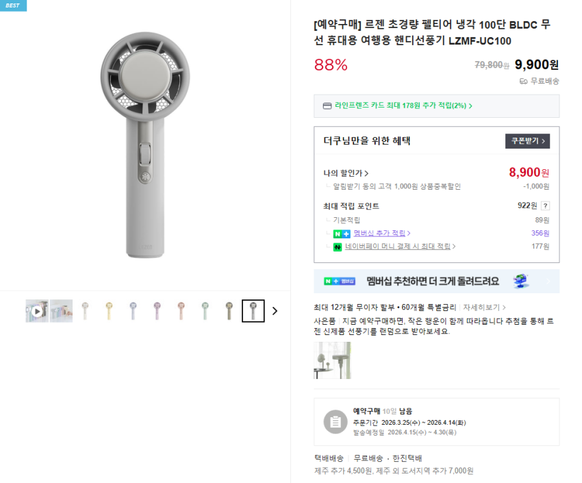 르젠 초경량 펠티어 냉각 핸디선풍기 8,900원