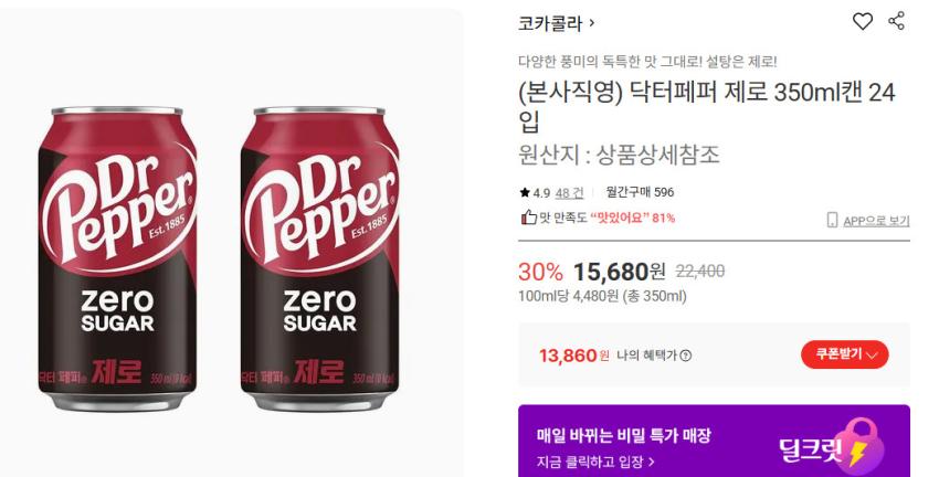 닥터페퍼 제로 350ML 24입 13860원