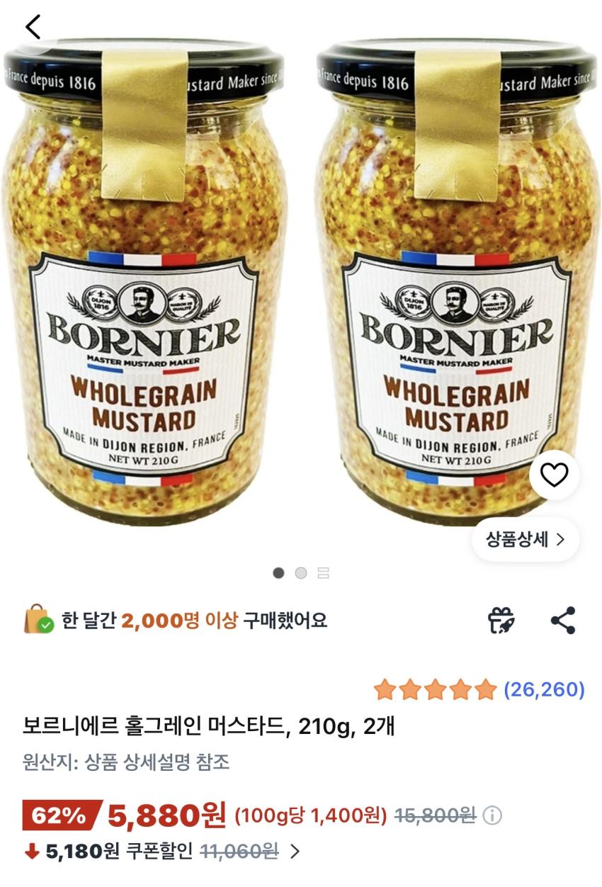 보르니에르 홀그레인 머스타드 210g 2개 5,880원