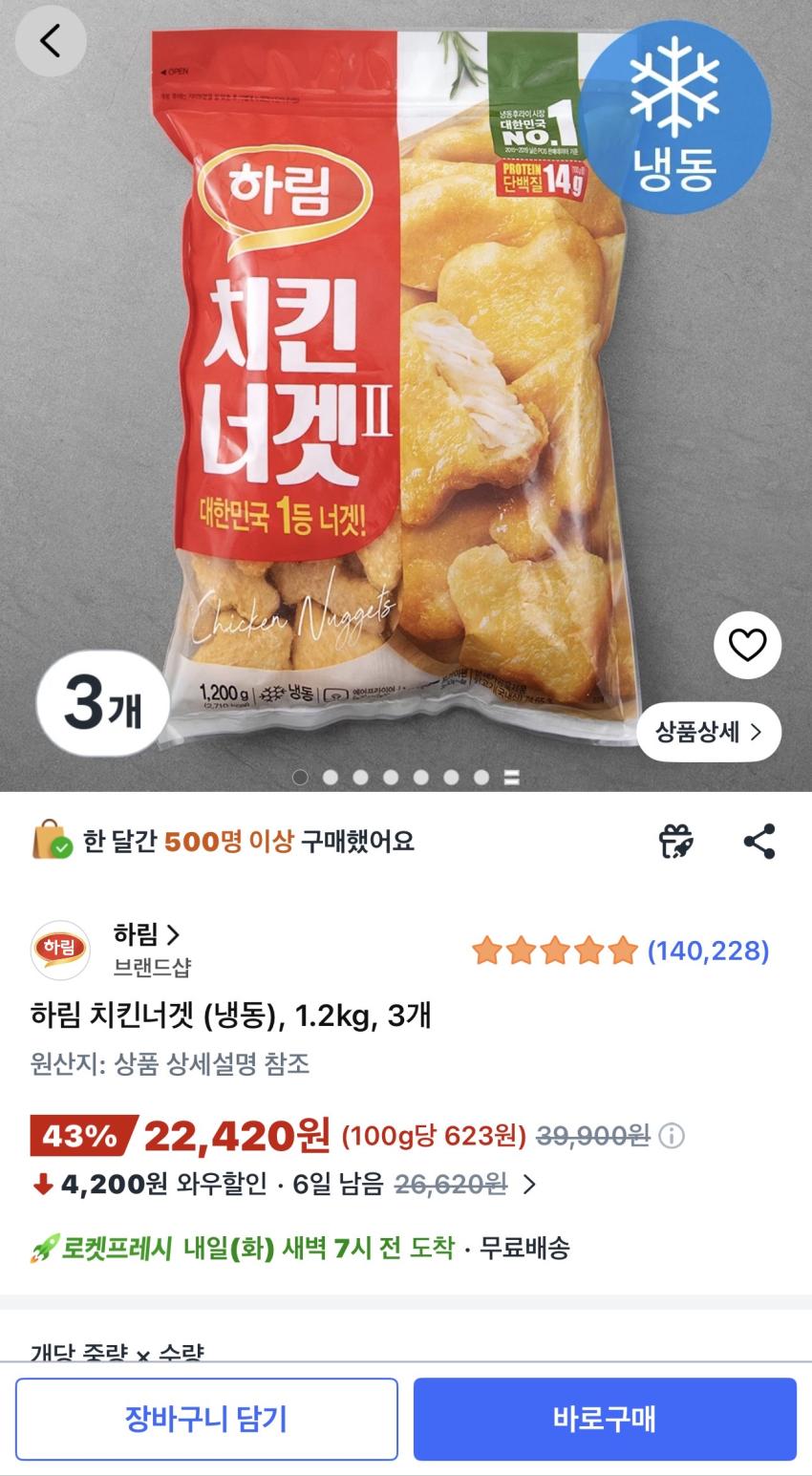 하림 치킨너겟 (냉동) 3.6kg 20,170원 - 딜모아