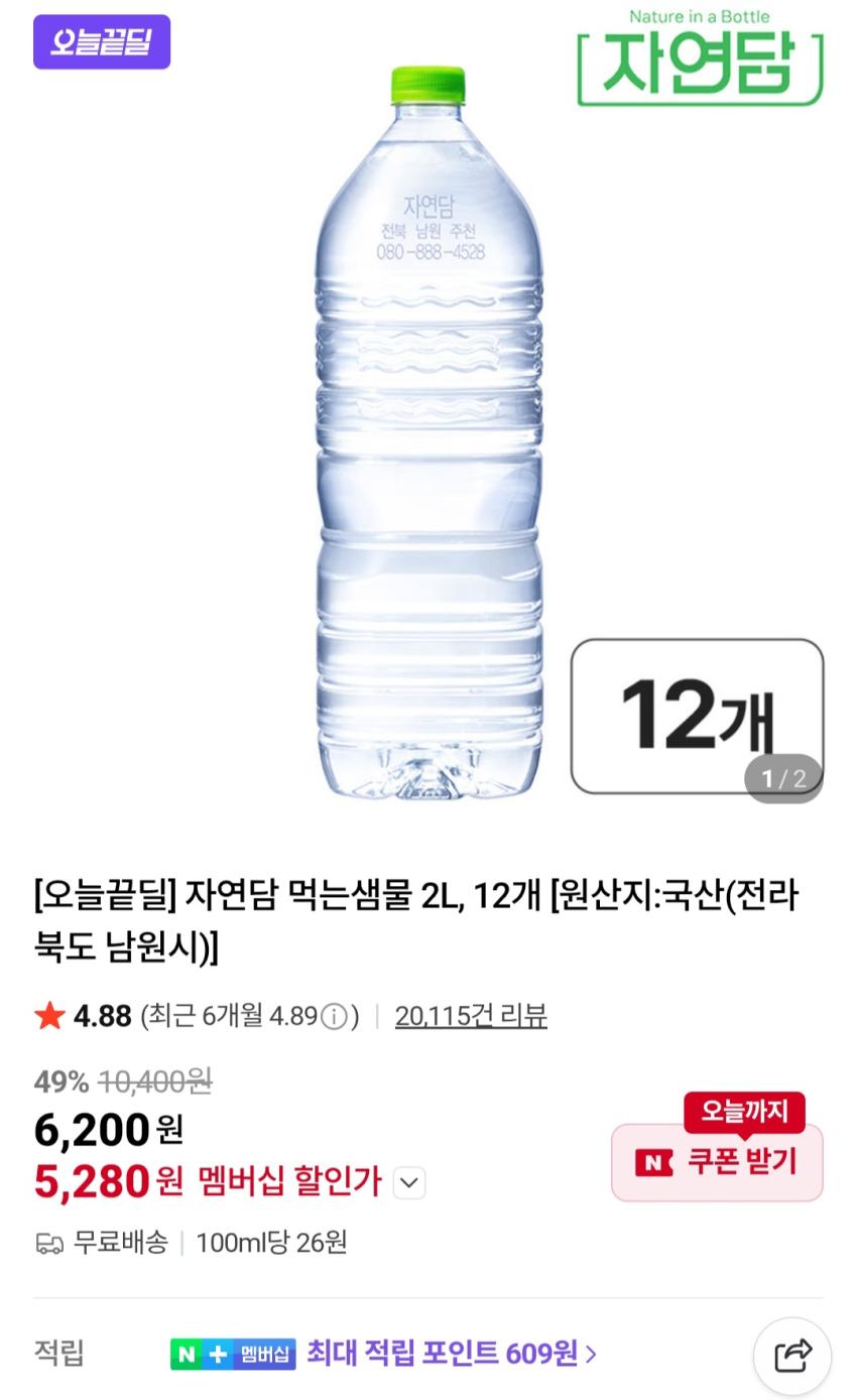자연담 먹는샘물 2L, 12개 5,280원
