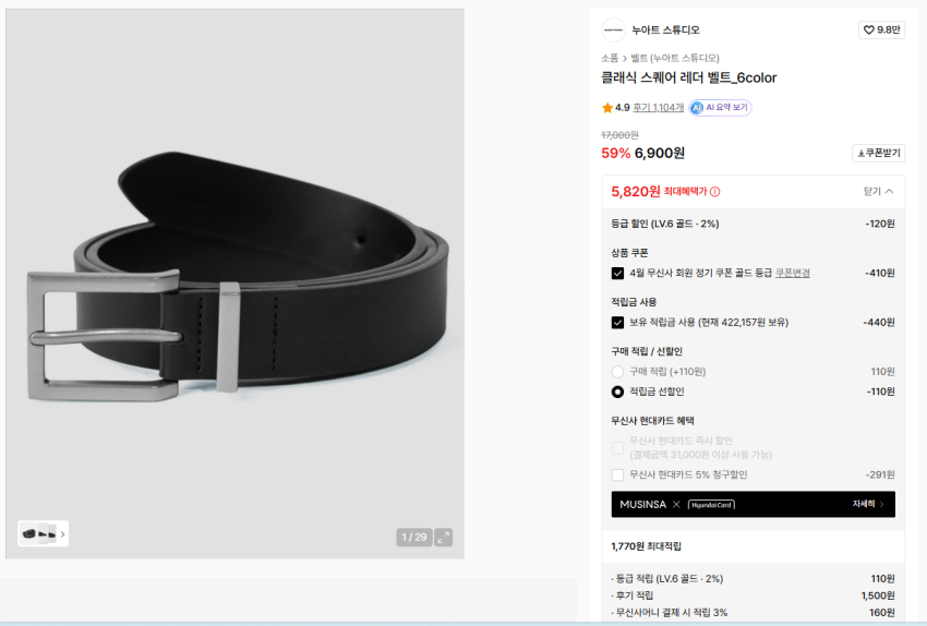 누아트 스튜디오 클래식 스퀘어 레더 벨트 6,900원