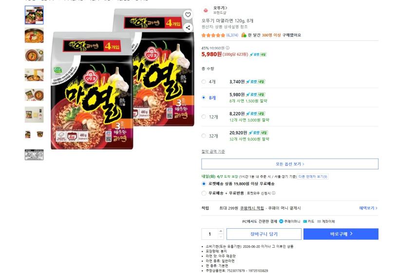 오뚜기 마열라면 120g x 8개 5980원 와우 무배