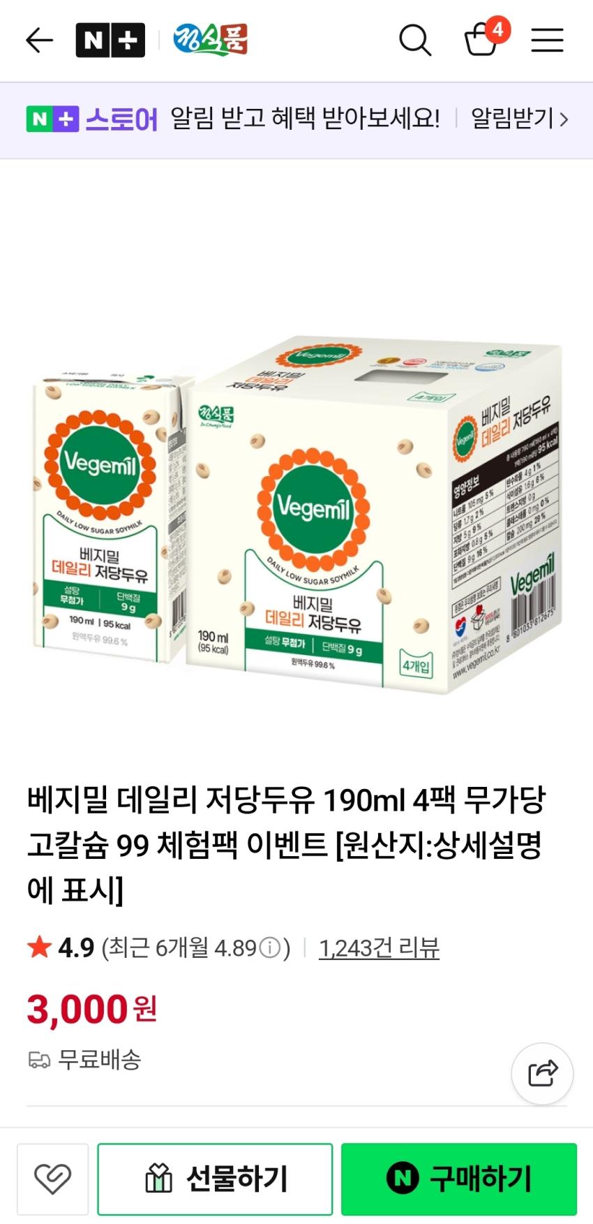 [체험팩]베지밀 데일리 저당두유 4팩 3,000원 무배