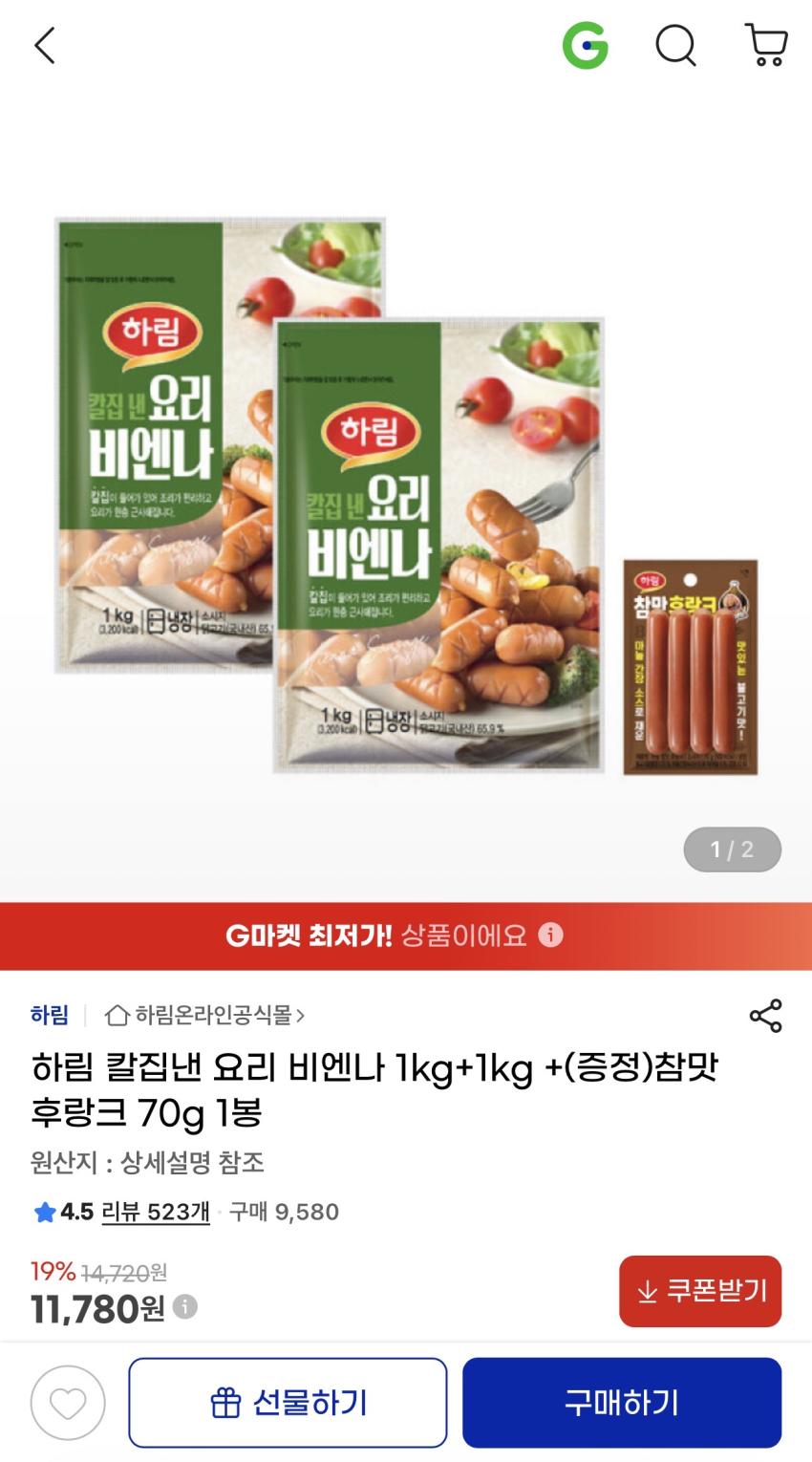 하림 칼집비엔나 2kg + 참맛 후랑크 70g 11,780원
