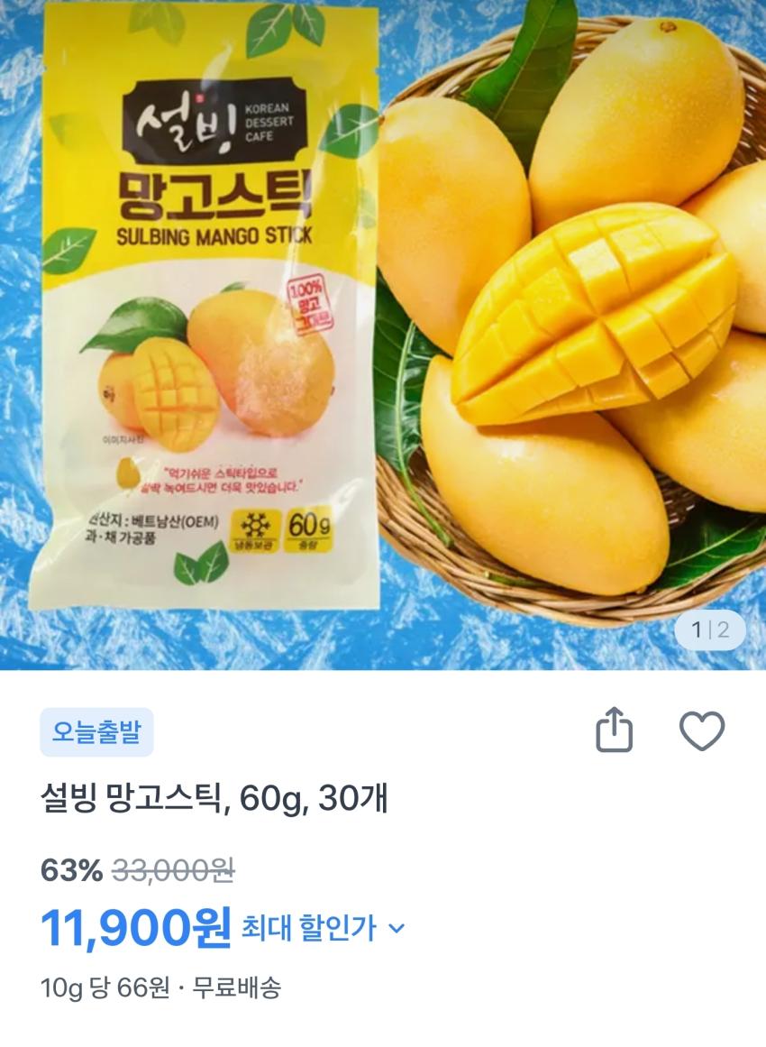 설빙 망고스틱, 60g, 30개 63%할인 (11,900원)