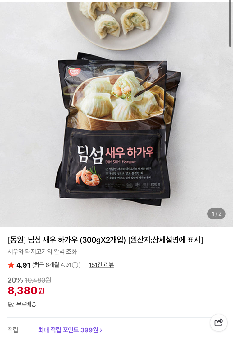 동원 딤섬 새우 하가우 2팩 8380원 (무배) - 딜모아