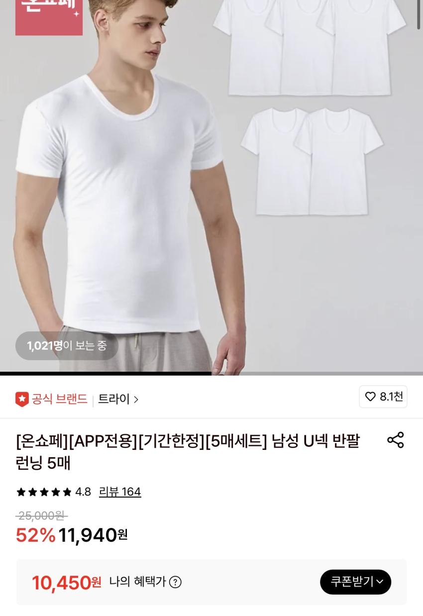 (12,000원 + 무료배송) 남성 U넥 반팔 런닝 5매