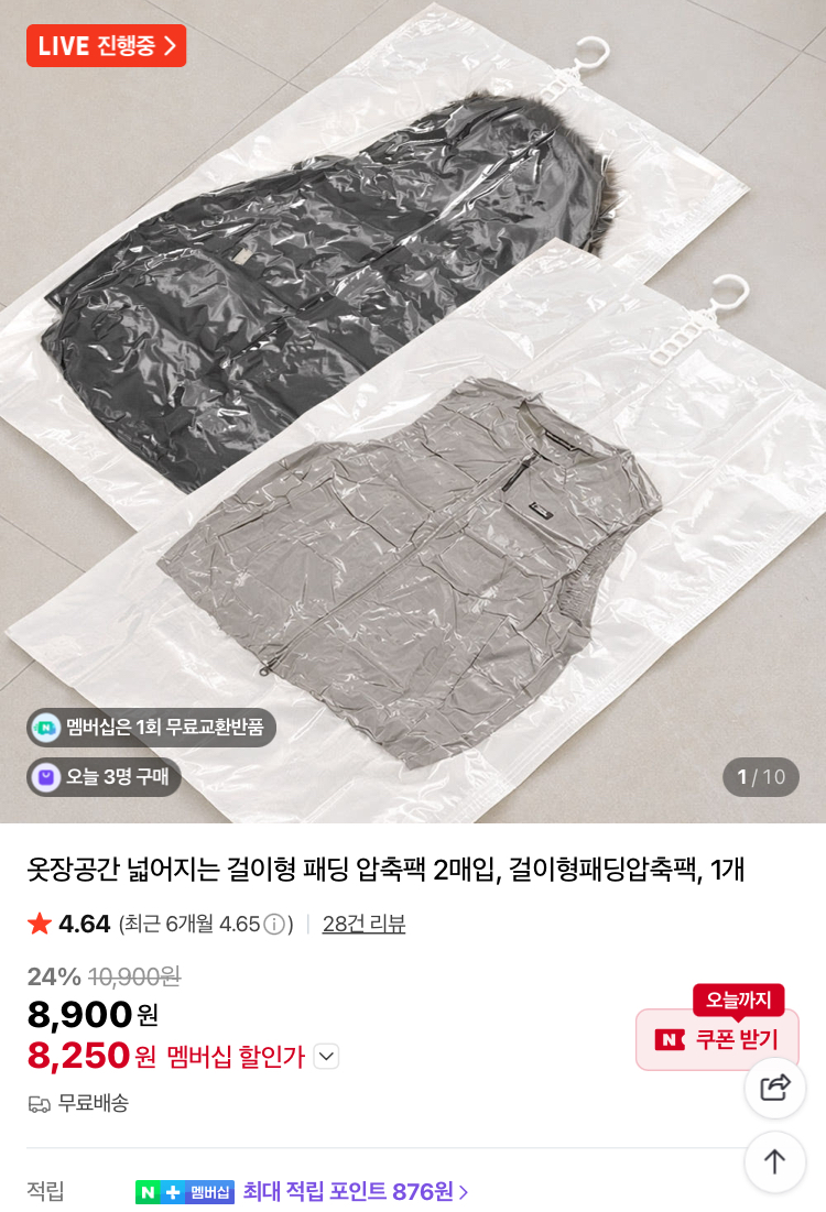 걸이형패딩압축팩 2매 8250원
