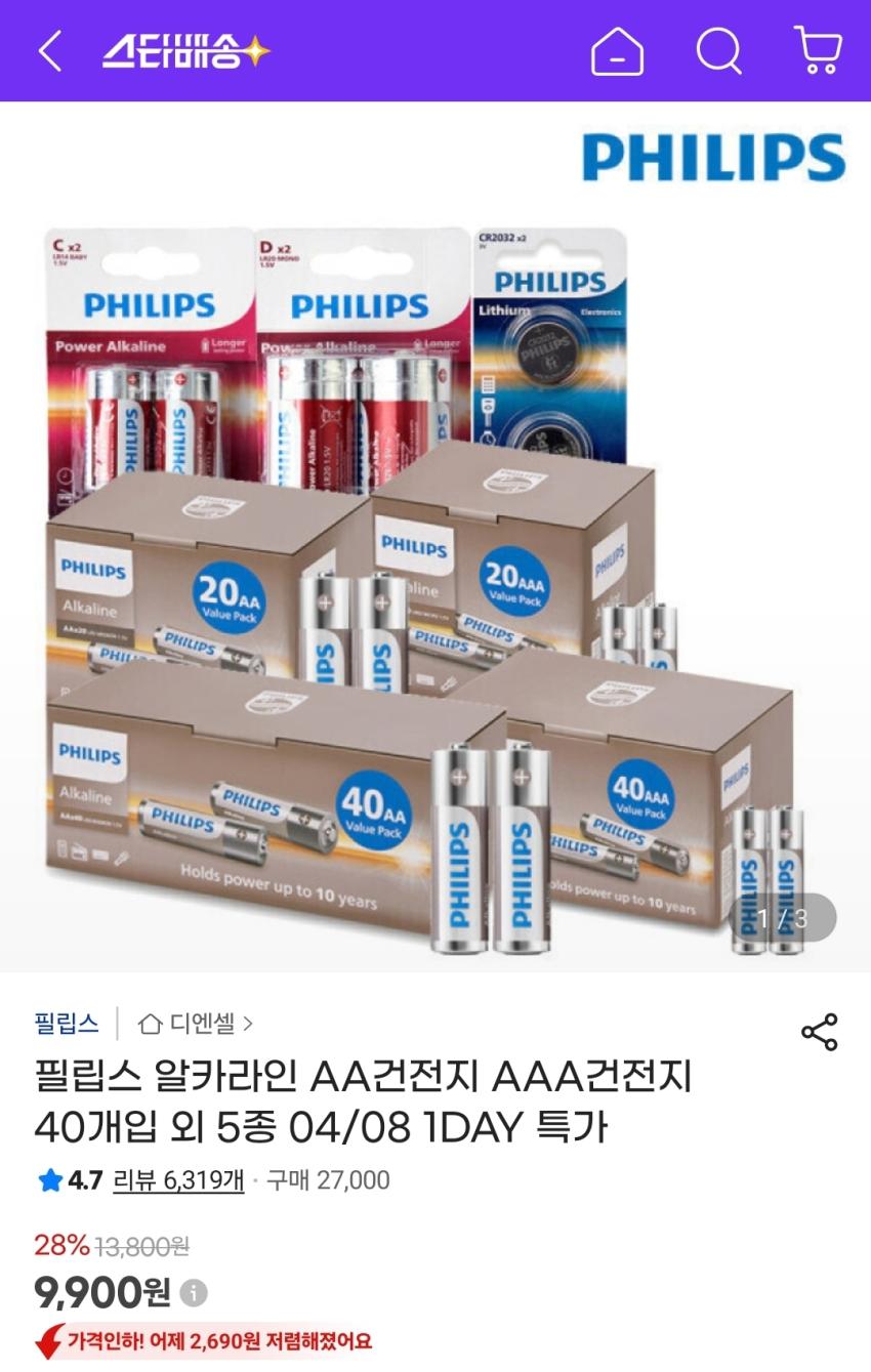 필립스 알카라인 AA/AAA건전지 40개입 9,900원