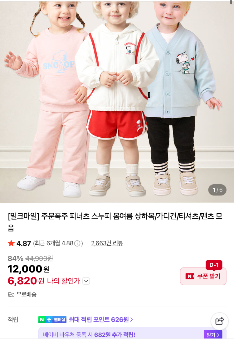 [아빠새] 밀크마일 피너츠 스누피 상하복 7470원~