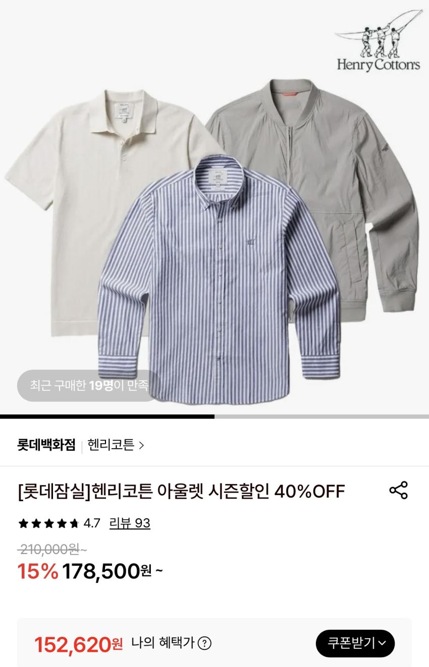 헨리코튼 아울렛 시즌할인 40%OFF