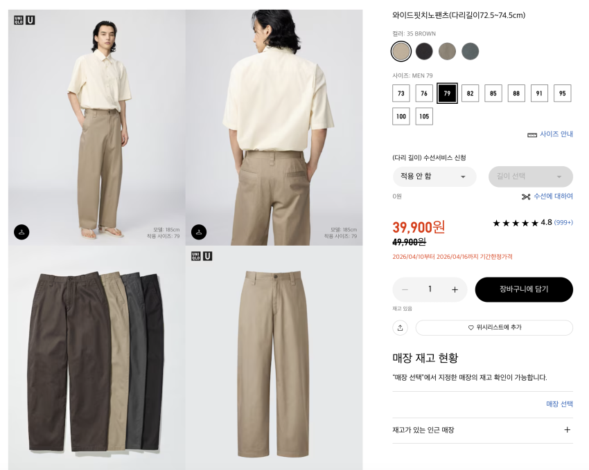 유니클로U 와이드핏치노팬츠 기간한정세일 39900원 - 딜모아