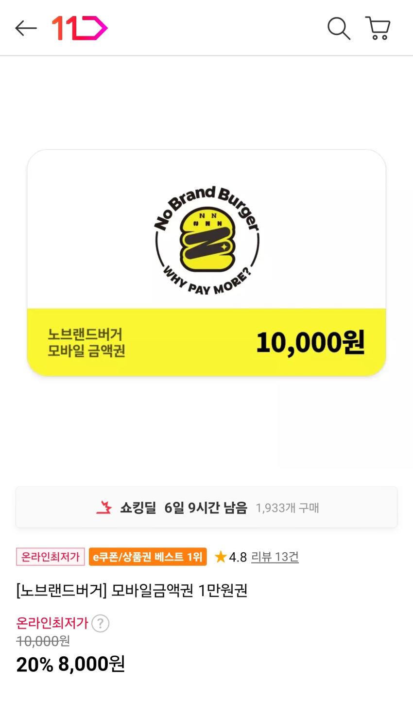 노브랜드버거 모바일금액권 1만원 20% 8,000원