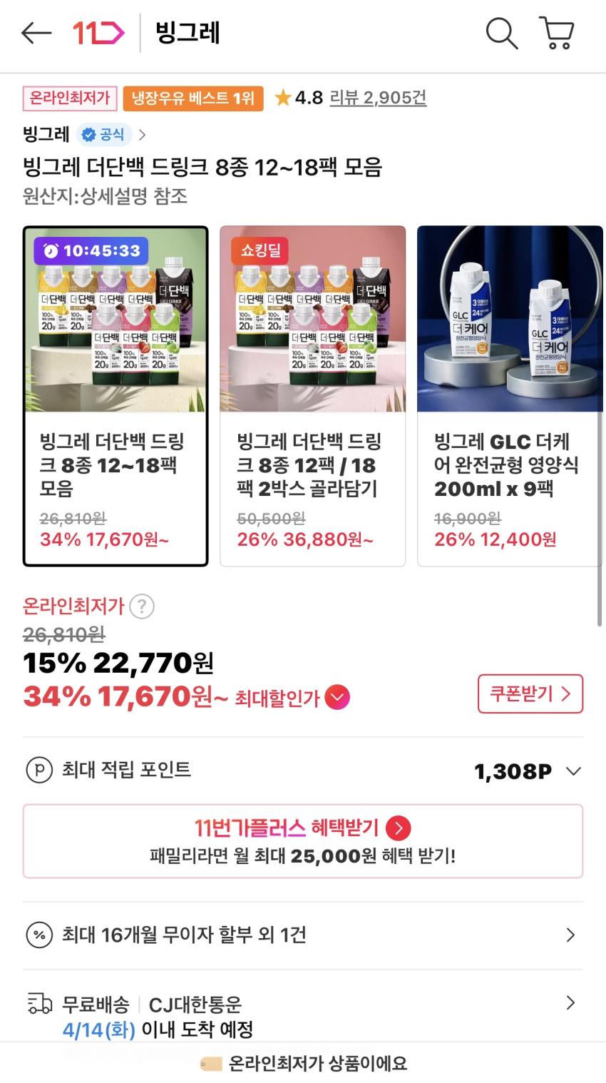 빙그레 더단백 드링크 250ml 18팩 17,670원(T멤버십)
