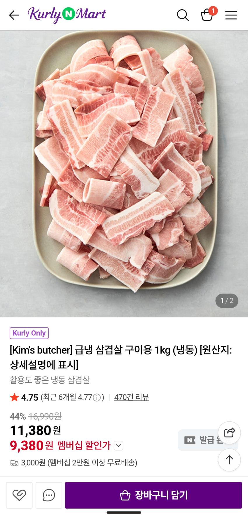 네이버 컬리/ 냉삼 1kg 9,380원