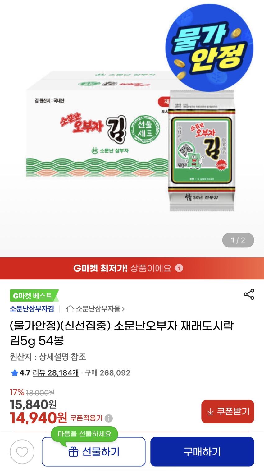 소문난오부자 재래도시락 김5g 54봉 14,940원