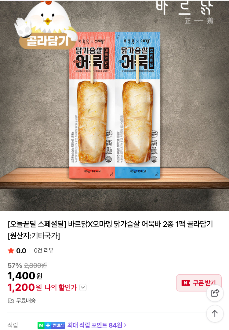 바르닭 닭가슴살 어묵바 1200원, 크런치 닭다리살...