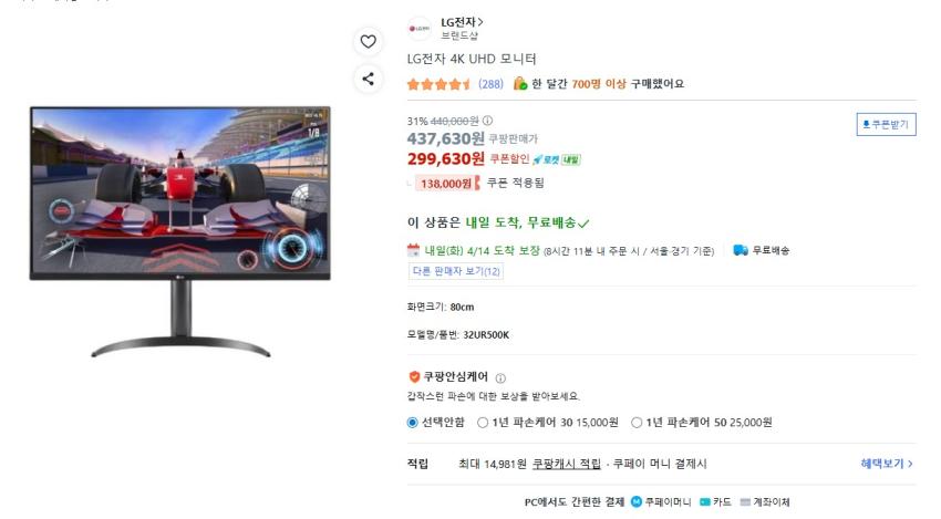 LG전자 4K UHD 모니터 32UR500K (296,300원)