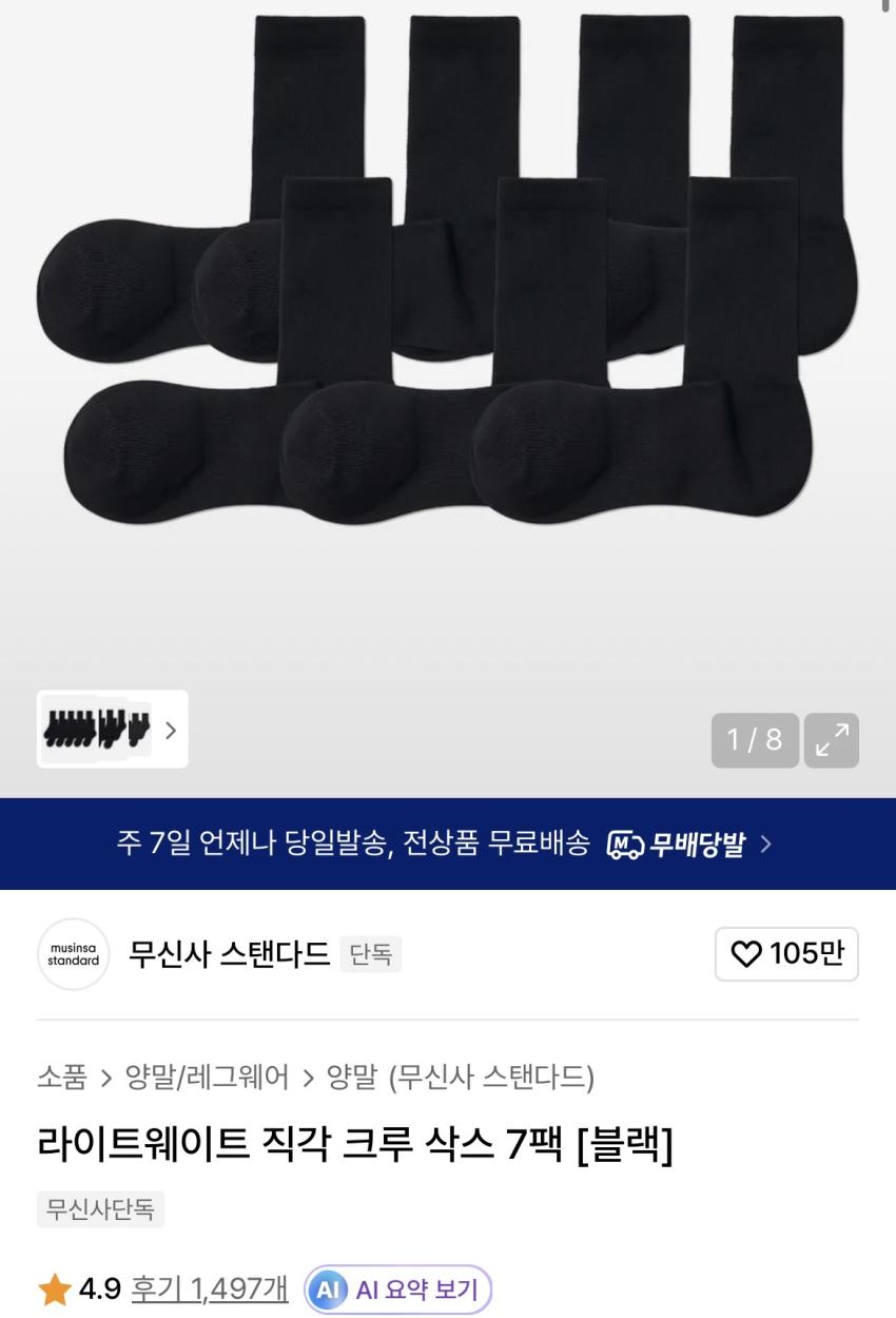 무탠다드 라이트웨이트 직각 크루 삭스 7팩 9,790원