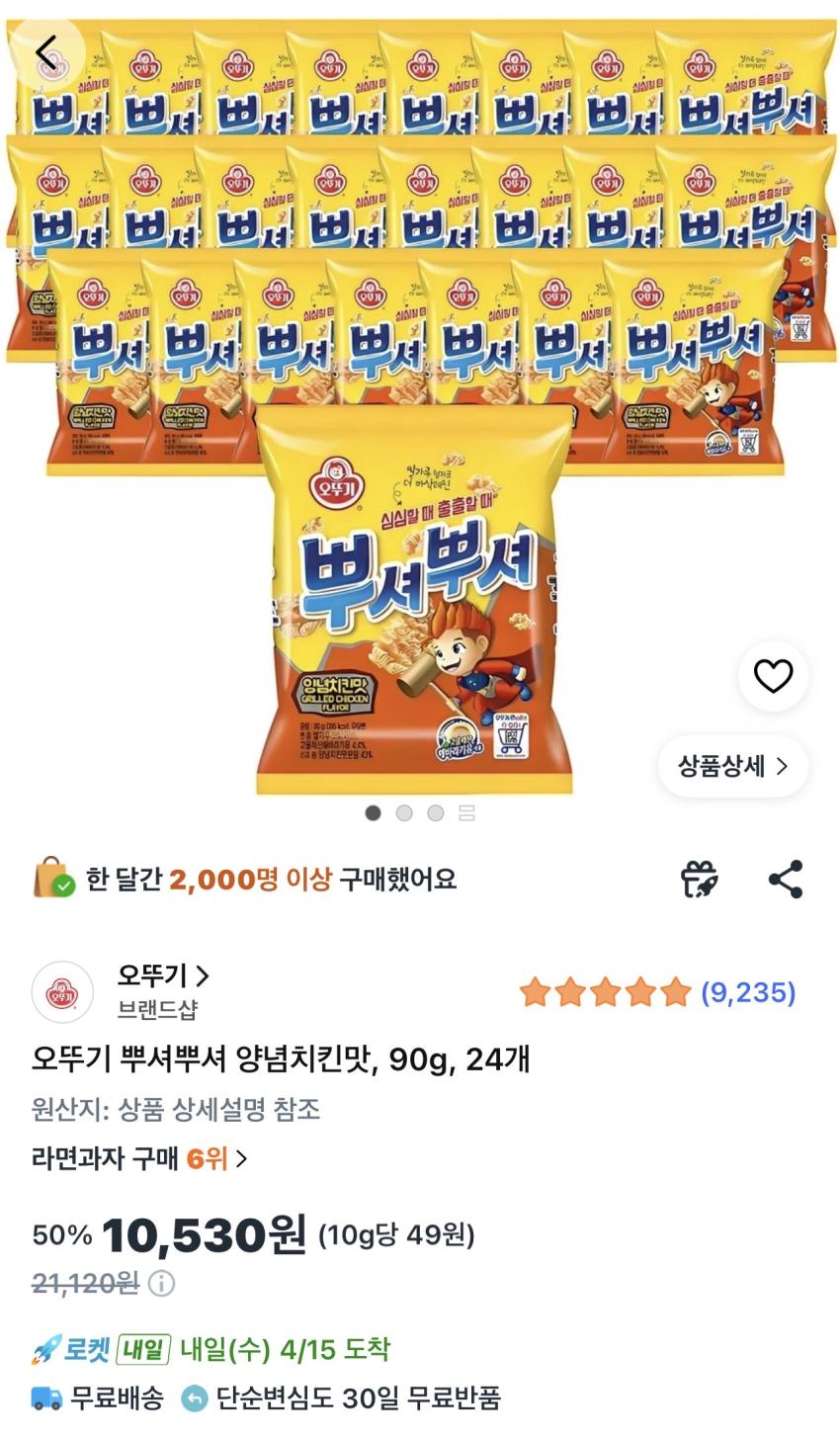 오뚜기 뿌셔뿌셔 양념치킨맛, 90g, 24개 10,530원