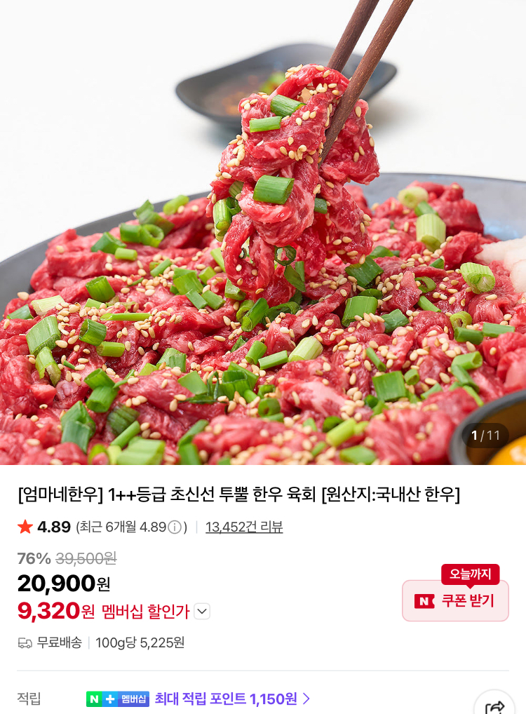 엄마네한우 1++등급 초신선 한우 육회 200g 9320원