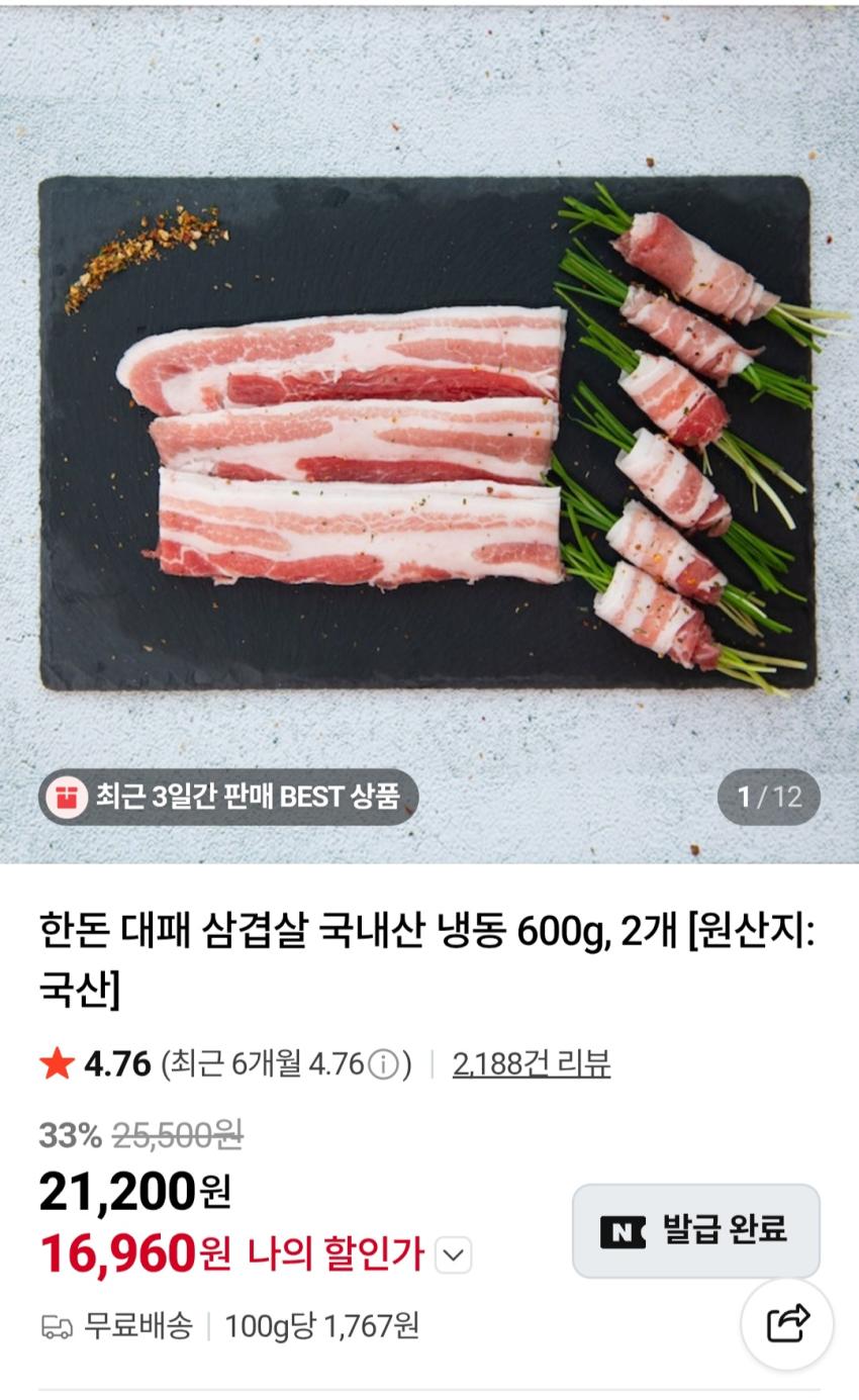 한돈 대패삼겹 600g 2팩 총1.2kg 16,960원