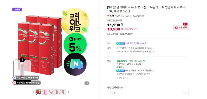 클리오 1450 고불소 치약 150g 6개 10900원 + 네...