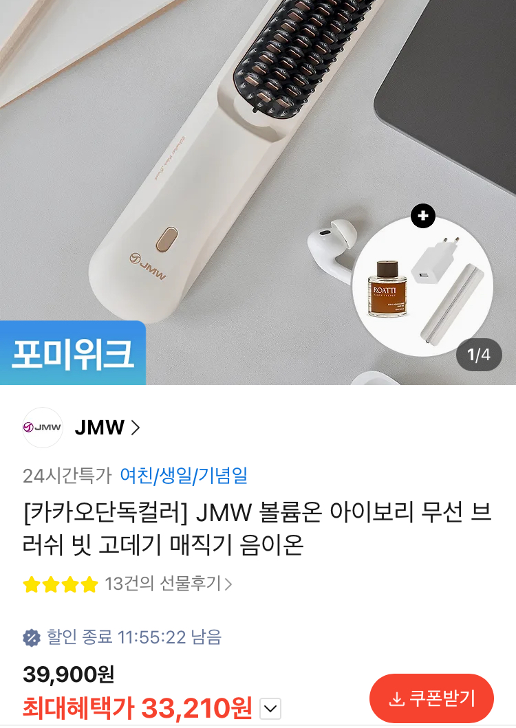 JMW 볼륨온 아이보리 무선 브러쉬 빗 고데기 3.3만원