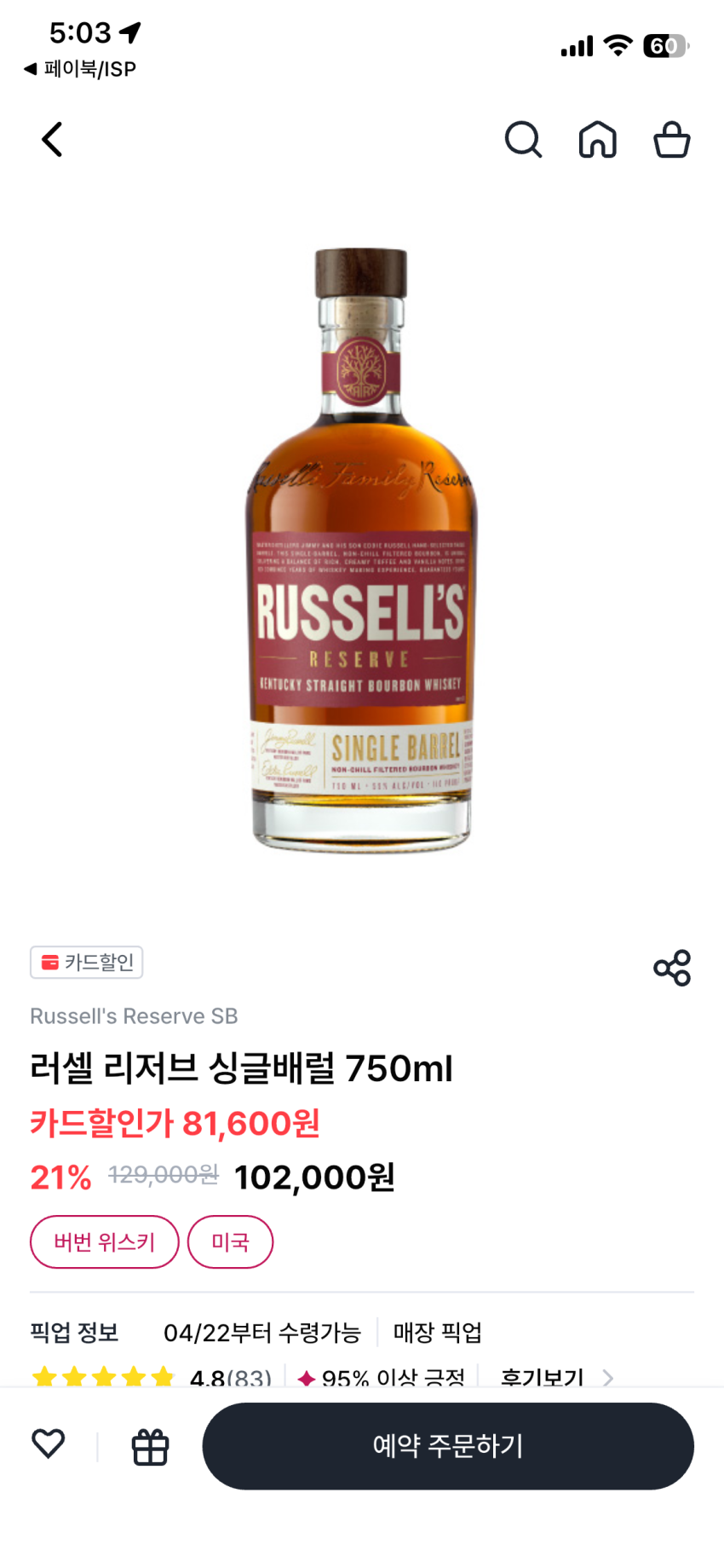(우리동네GS) 러셀 리저브 싱글배럴 80,600원