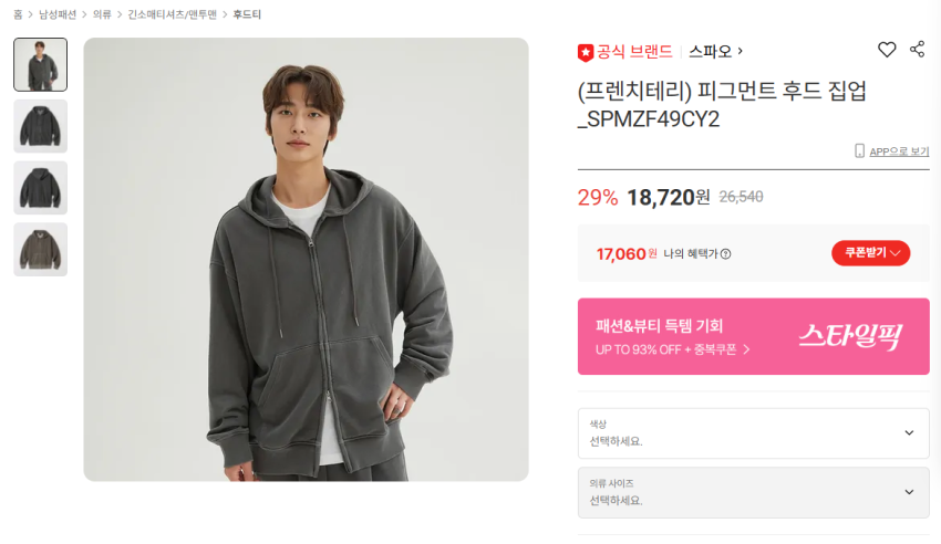 스파오 피그먼트 후드 집업_SPMZF49CY2 17,060원 - 딜모아
