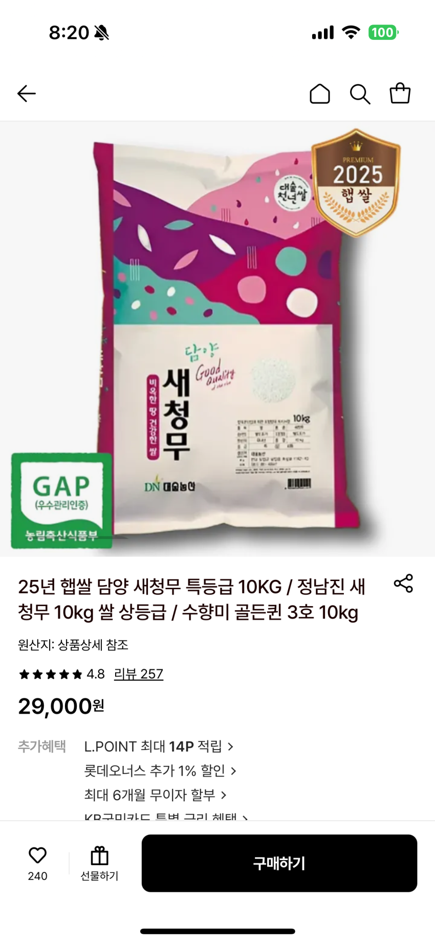 25년 햅쌀 담양 새청무 특등급 10KG 29,000원 무배