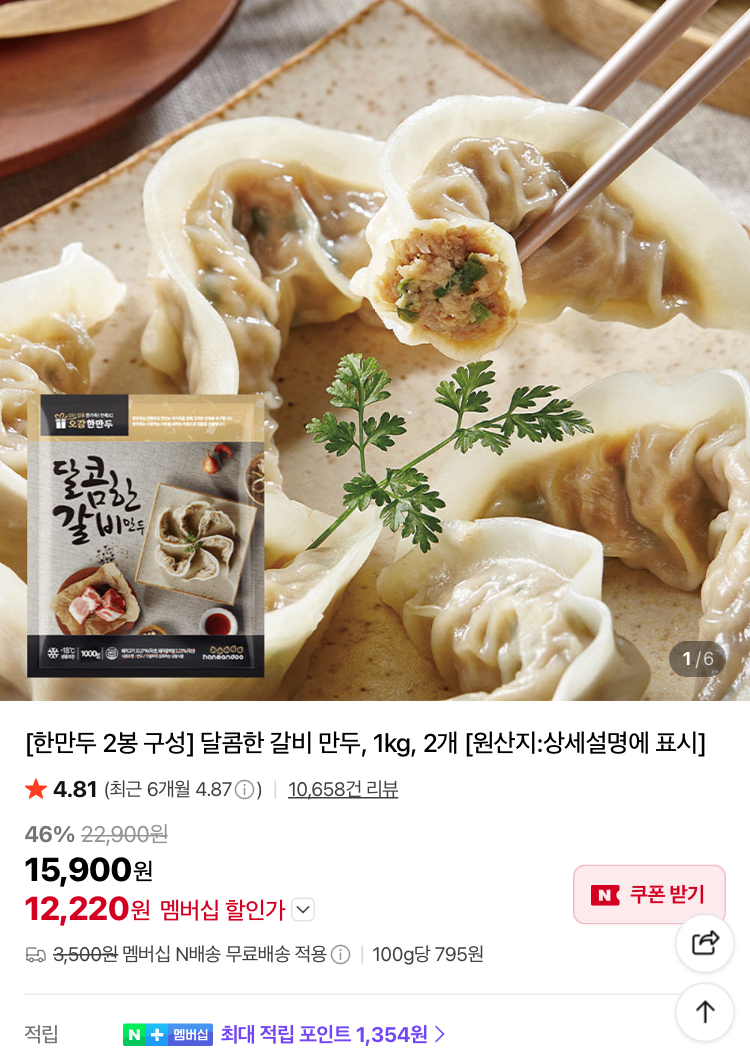 달콤한 갈비 만두 1kg 2봉 1.2만원