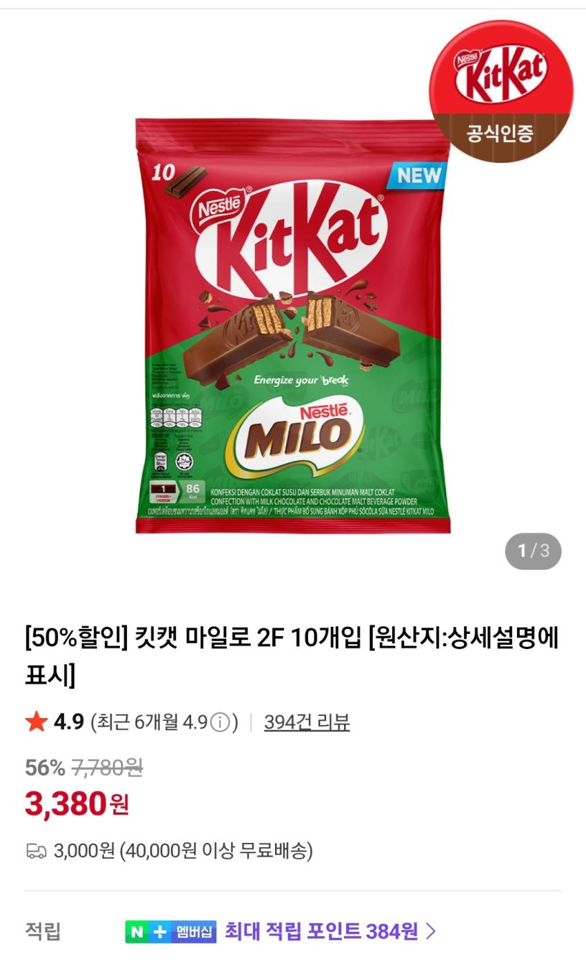 킷캣 마일로 160g 3380원 (2개부터 무배)