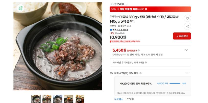 병천식 순대국밥 180g x 5팩 10900원 무배