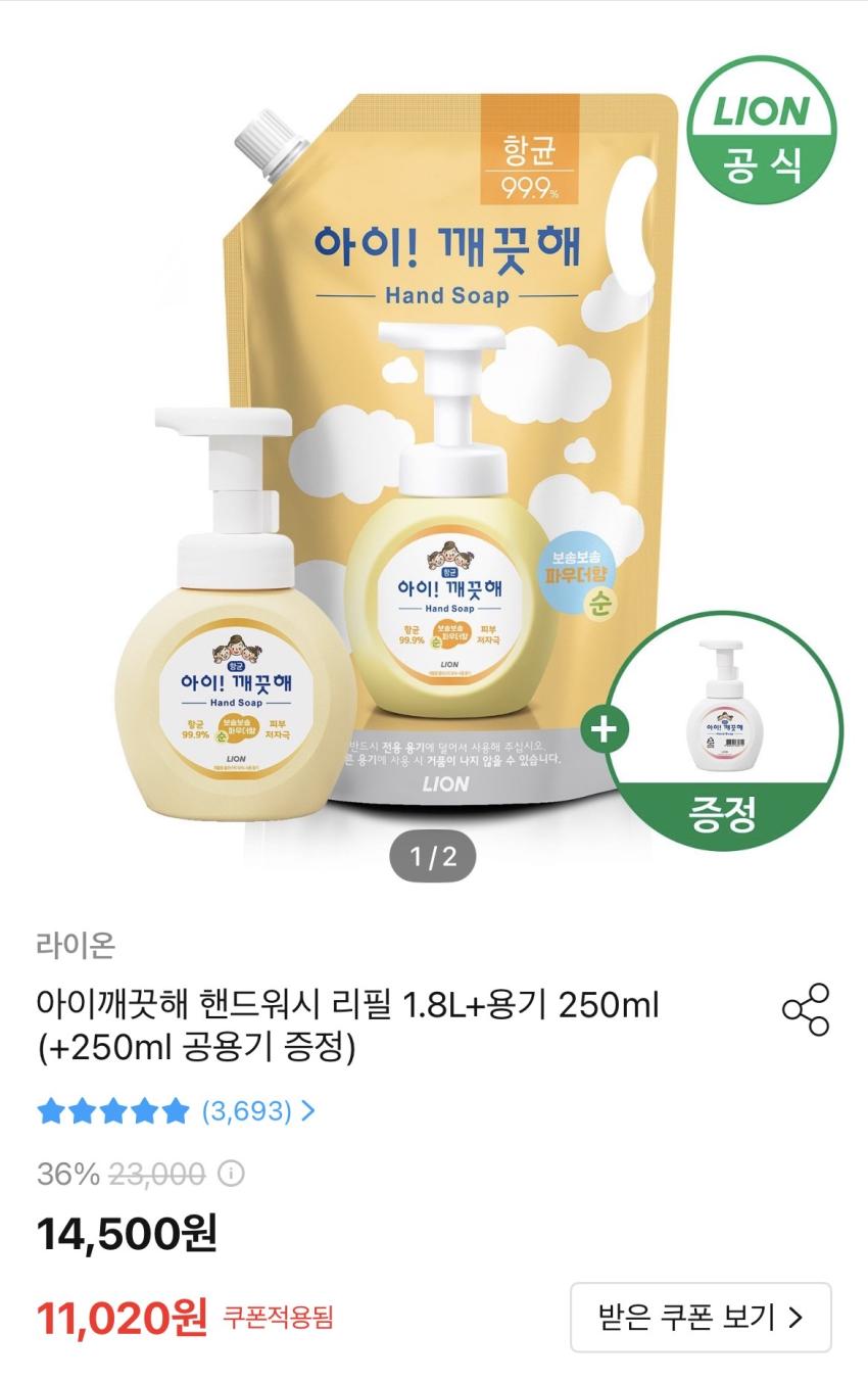 아이깨끗해 용기250+공용기+리필 1.8 9,918원