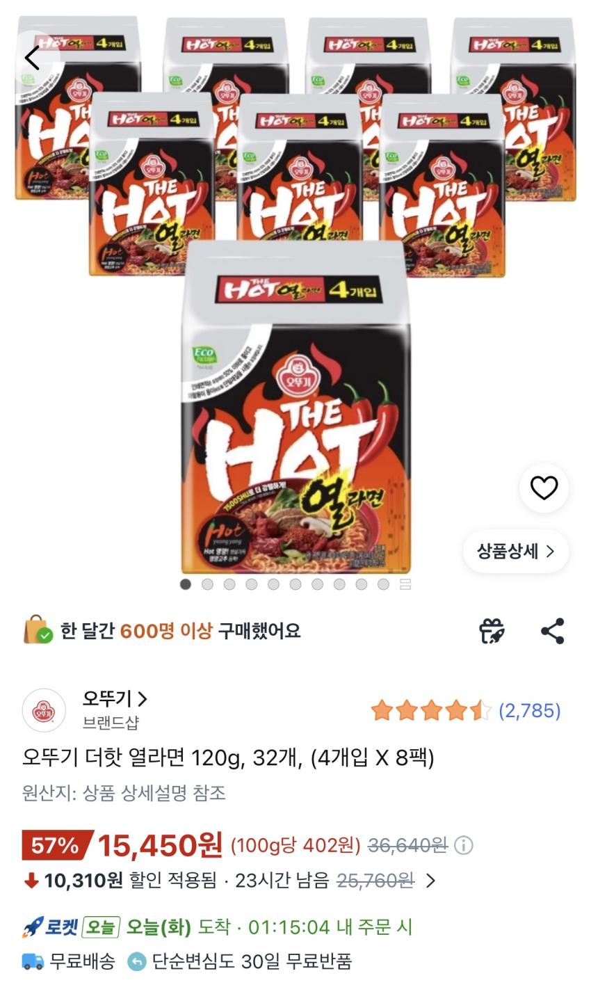 오뚜기 더핫 열라면 32봉 15,450원