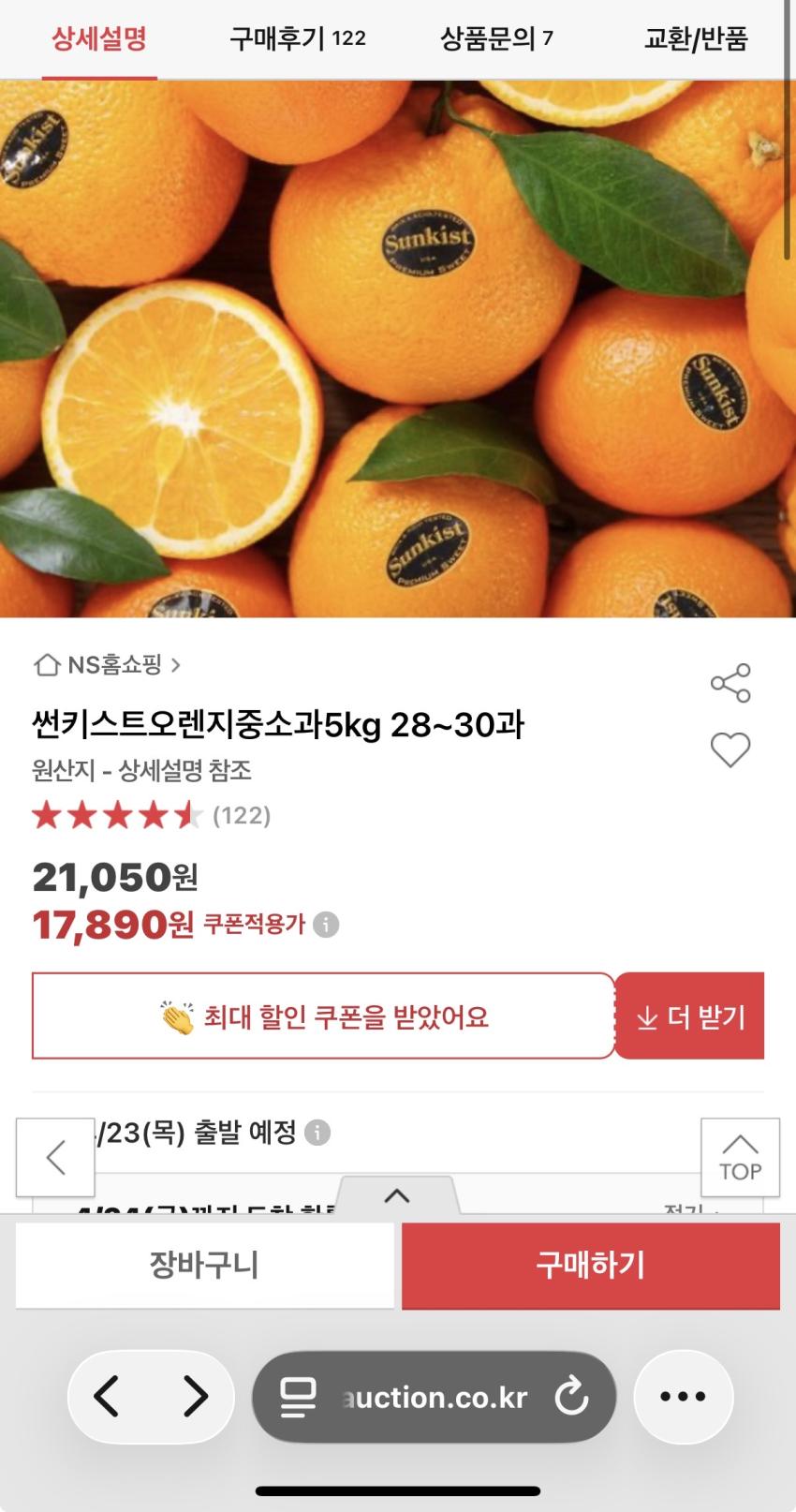 옥션) 썬키스트 오렌지 중소과 5kg 17,890원