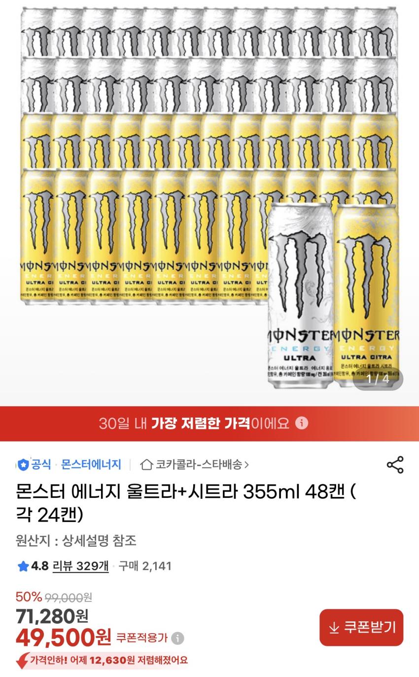 몬스터 에너지 울트라+시트라 355ml 48캔 49,500원