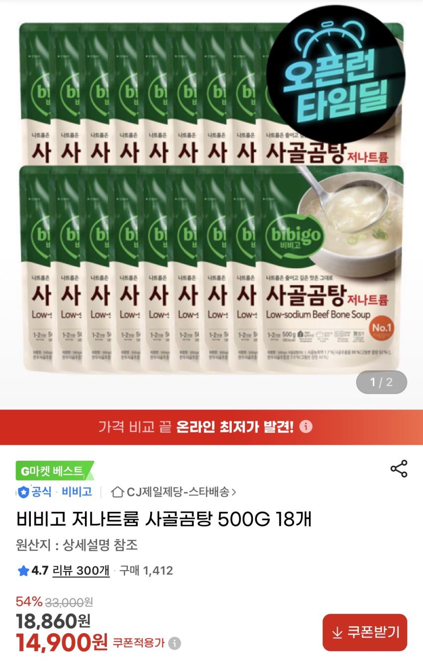 비비고 저나트륨 사골곰탕 500G 18개 14,900원
