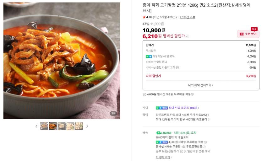 무배 홍야 직화 고기짬뽕 2인분 6,210원
