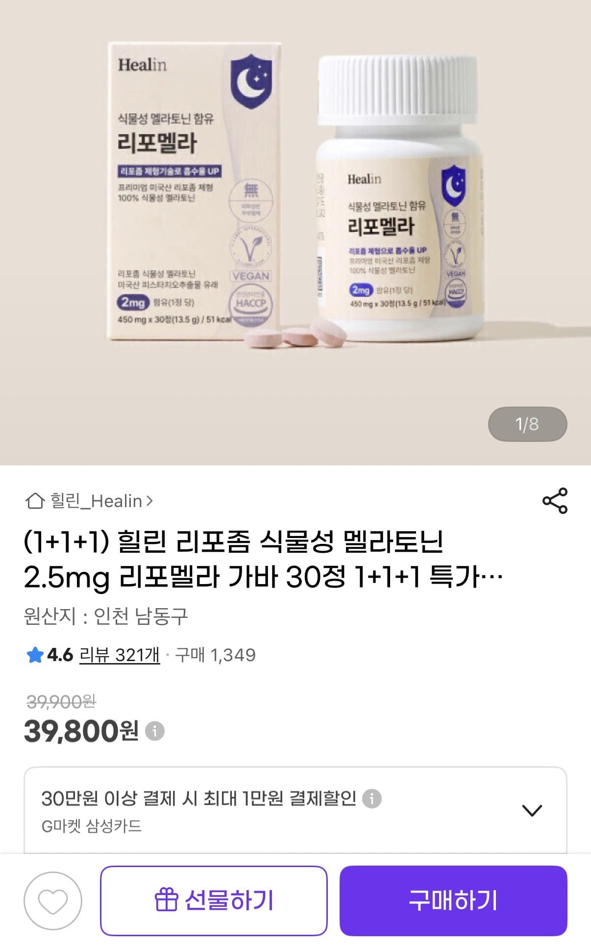[G마켓]힐린 리포좀 식물성 멜라토닌 2mg 30정 1+1+1 (39,800원/무배) - 딜모아